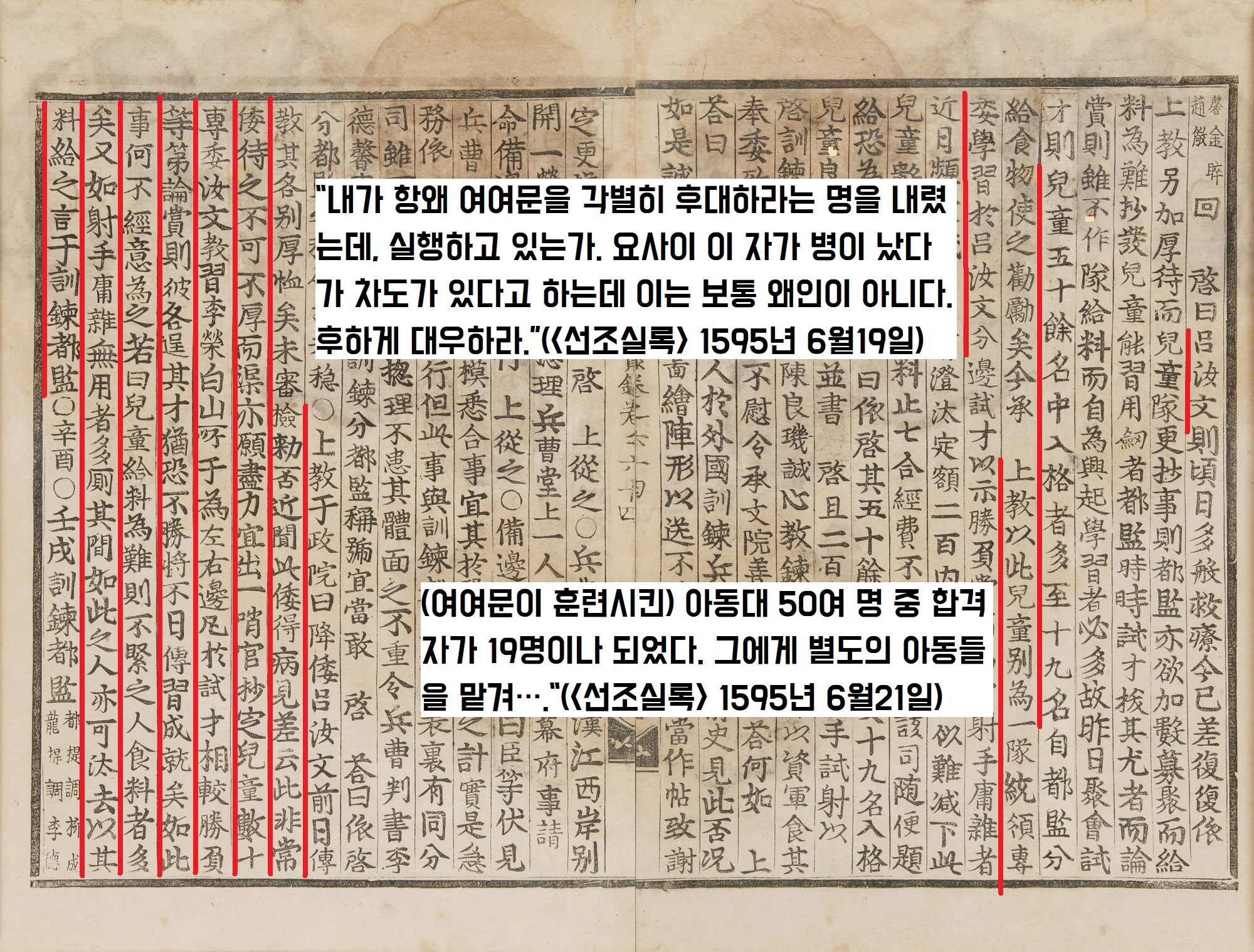 여여문이 누구이기에 선조 임금으로부터 특별대우를 받았을까요. 그럴만 했습니다. 여여문은 훈련도감에서 결성한 ‘아동대(兒童隊)’를 조련한 책임자였는데요. 검술을 익히게 하고 사수를 양성하게 했죠. 그런데 그 성과가 대단했습니다.