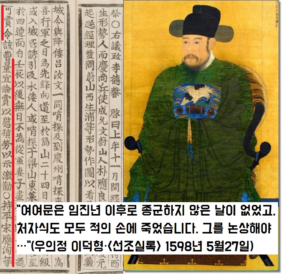 그로부터 두 달이 지난 1598년(선조 31) 5월 17일 우의정 이덕형은 “여여문은 임진란 이후로 종군하지 않은 날이 없었고, 처자식도 모두 적의 손에 죽었다”면서 “여여문을 논상함으로써 격려하는 뜻을 보여야 한다”고 촉구합니다.