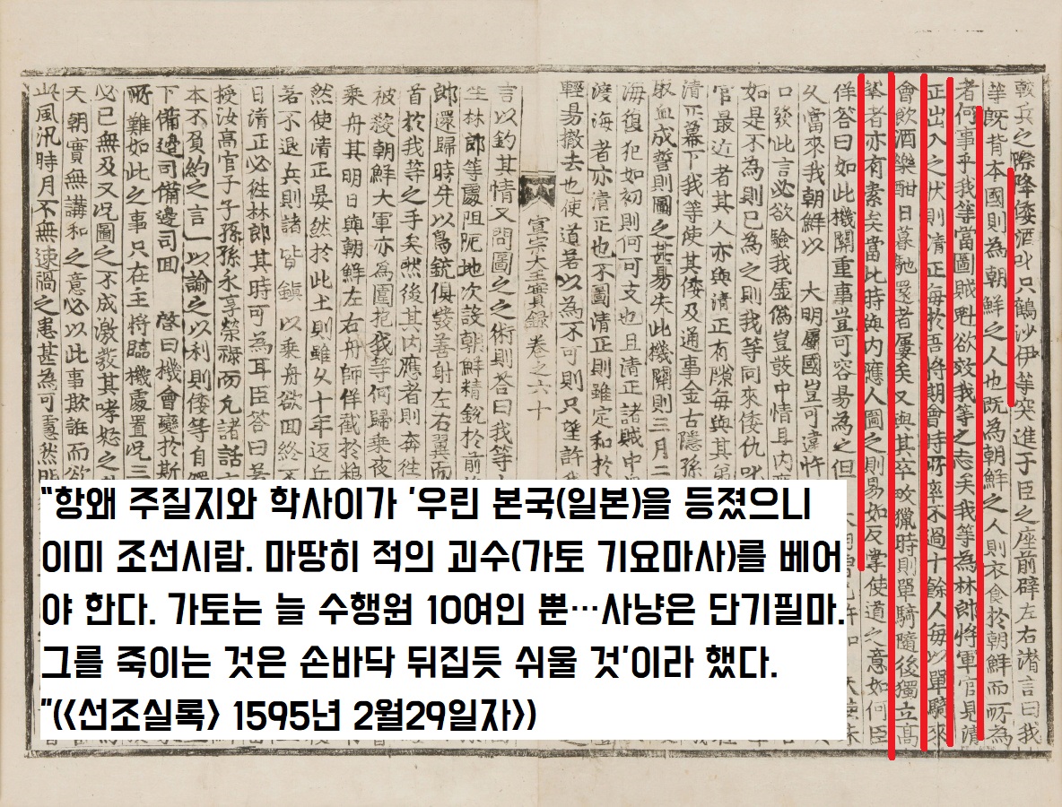 “우린 본국(일본)을 등졌으니 이미 조선시람입니다. 마땅히 적의 괴수(가토 기요마사)를 베어야 합니다.”
