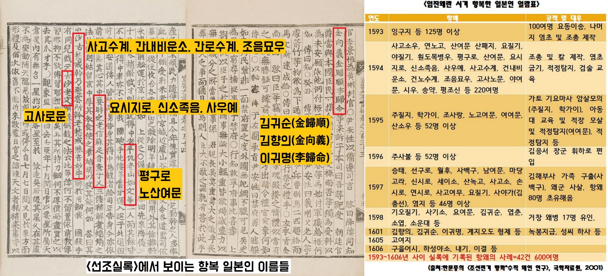 한 연구자가 <실록>에 등장하는 항왜(귀화 혹은 항복한 일본인)의 수를 집계했는데요. 모두 42건에 600명에 달합니다. 기록된 숫자만 이 정도이니, 갖가지 이유로 항복하거나 귀화한 왜인들이 꽤 많다는 사실을 알 수 있습니다.