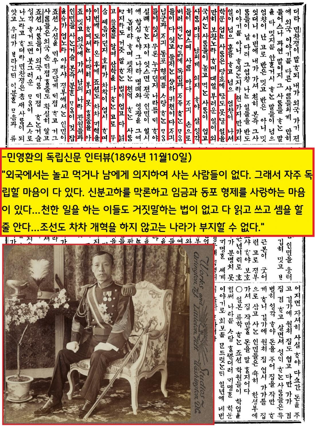 민영환은 독립신문과의 귀국 인터뷰에서 “조선도 (외국처럼) 개혁을 하지 않고는 나라가 부지할 수 없다는 것을 믿어야 한다”고 설파했다.