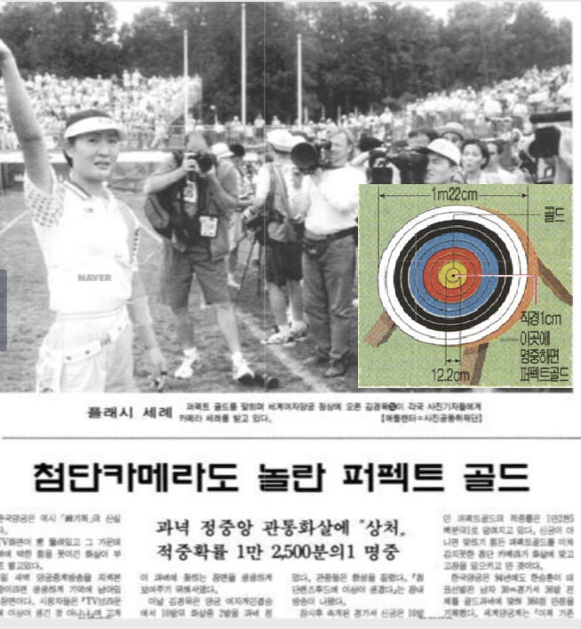 그렇지는 않을겁니다. 여러분은 1996년 8월1일 미국 애틀란타 올림픽에 출전한 김경욱 선수가 양궁 여자개인 결승에서 ‘퍼펙트 골드’를 기록한 사실, 기억하시죠. 당시 기사를 보면 이렇게 나옵니다.