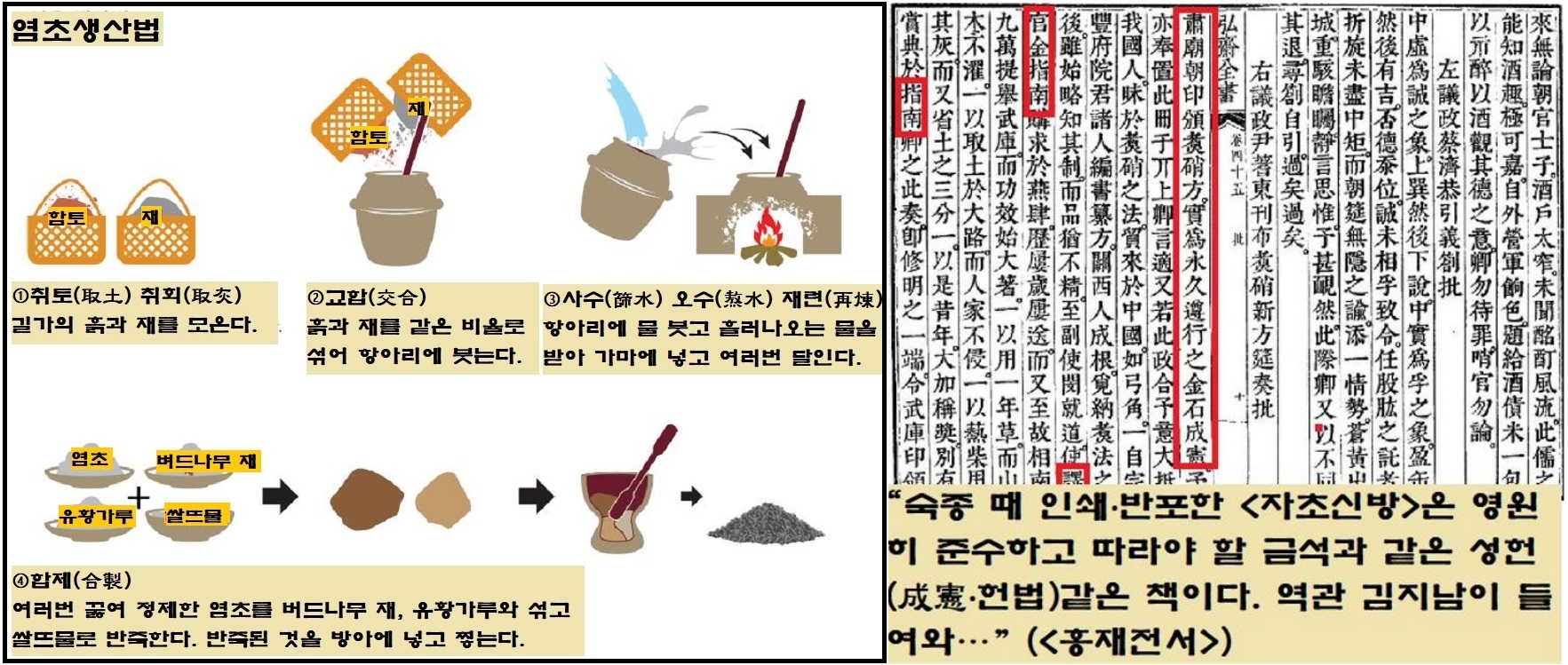 정조의 개인문집(<홍재전서>)와 <정조실록>(1796년 5월12일조)은 “이제 길가의 흙에서 마음껏 염초 구하게 됐다”면서 “숙종 때 인쇄·반포한 <(신전자초방>은 영원히 준수하고 따라야 할 금석과 같은 성헌(成憲·헌법)같은 책”이라고 극찬했습니다. 이렇게 얻은 ‘똥흙’에서 어떻게 염초가 만들어질까요. 똥흙을 잿물과 섞어 끓인 뒤 졸여서 생기는 결정을 얻어내는 건데요.