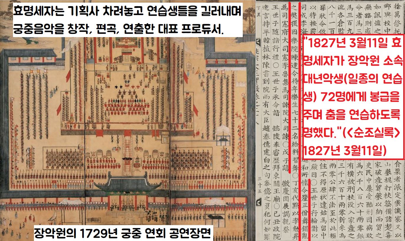 <순조실록>은 “1827년(순조 27) 3월11일 효명세자가 장악원 소속의 대년악생(待年樂生·일종의 연습생) 72명에게 봉급을 주어 춤을 연습하도록 명했다”고 기록했는데요. 요즘으로 치면 효명세자가 기획사가 차려놓고 김창하 등과 함께 연습생들을 기르고, 훈련시킨 뒤 궁중음악을 창작·편곡·연출한 대표 프로듀서였다는 사실을 알 수 있습니다.