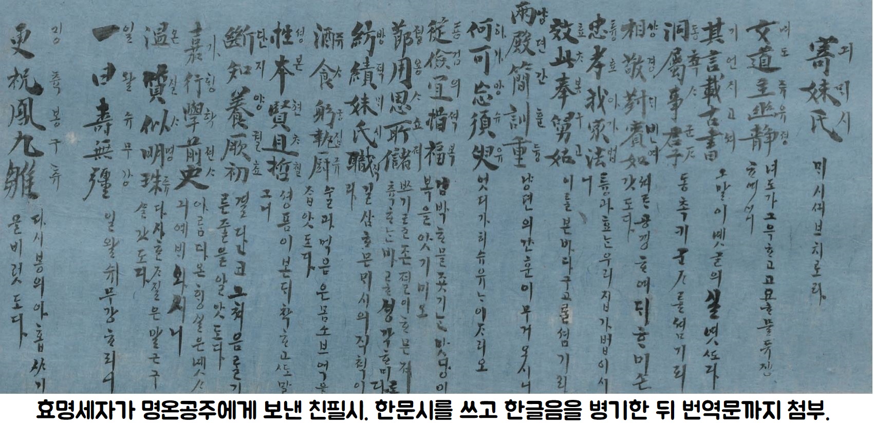 이중 여동생들을 끔찍히 예뻐한 시를 다수 남긴 것이 눈길을 끌죠. 특히 1살 어린 누이동생(명온공주·1810~1832)에게는 사흘 간격으로 시를 보냈습니다. 동생에게 보내는 친필시는 한시를 원문으로 적고 다시 한글음을 병기했으며 그 번역문까지 첨부했는데요. 어려운 어구는 한글로 주석까지 달아놓았습니다.
