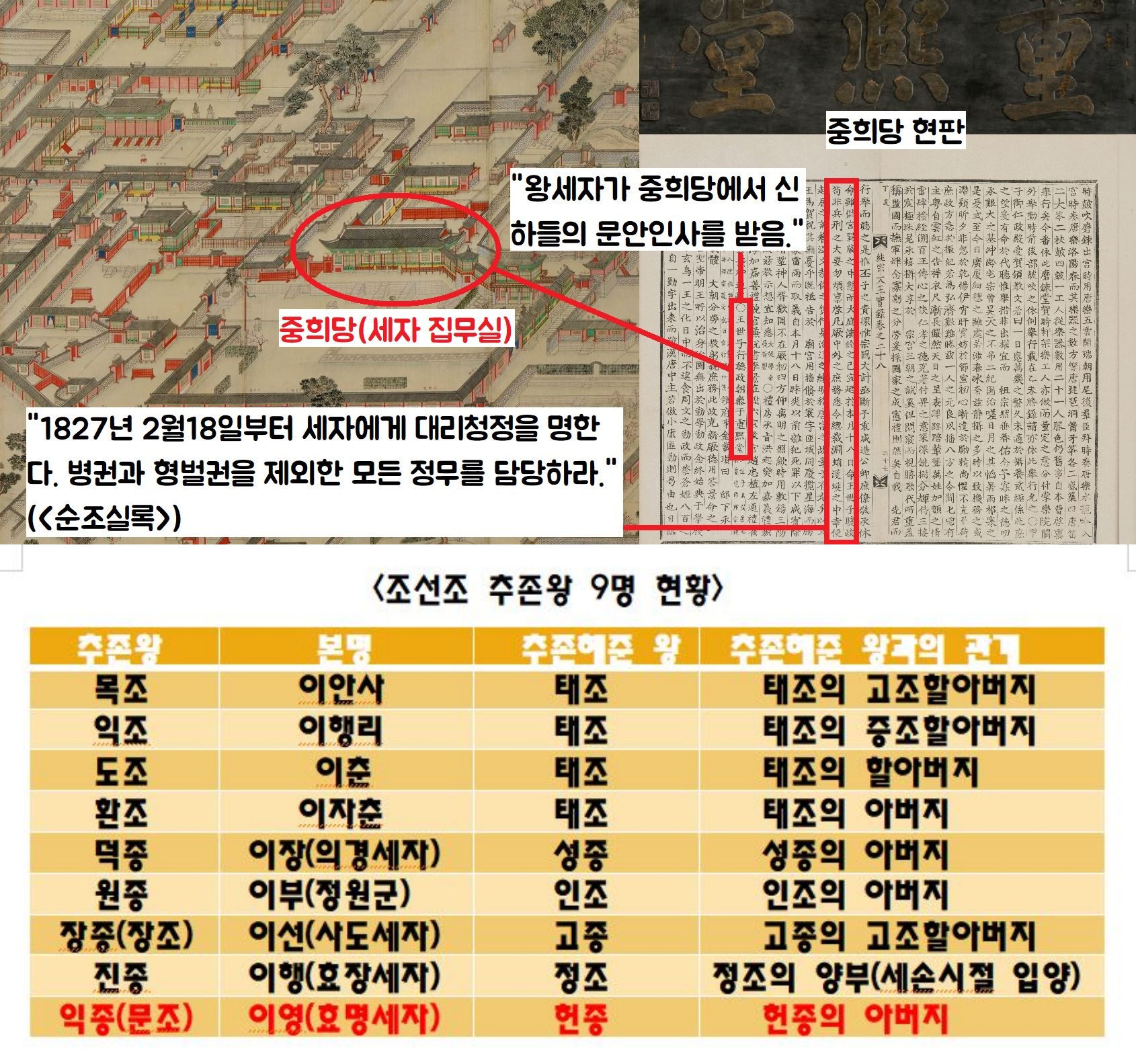 그러나 조선을 통틀어 살아 생전에는 임금이 아니었지만 사후에 임금으로 모신 ‘추존왕’이 한 둘입니까. 효명세자를 포함해서 9명이나 됩니다. 그런 분들 중 ‘효명세자’ 만큼은 ‘국왕대우’를 받아야 한다는 평가가 만만치 않습니다. 왜냐면 효명세자가 “대리청정하라”는 부왕(순조)의 명에 따라 실제로(1827년 2월18~1830년 5월6일) 조선을 다스렸기 때문입니다.