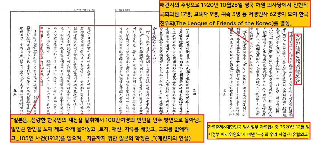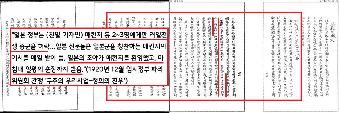 “…일본 신문들은 일본군을 칭찬하는 매킨지의 기사를 매일 받아 썼다. 일본의 조야가 매킨지를 환영했고, 마침내 일왕의 훈장까지 받았다.”(1920년 12월 임시정부 파리위원회가 간행한 ‘구주의 우리사업-정의의 친우’에서)