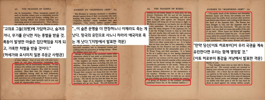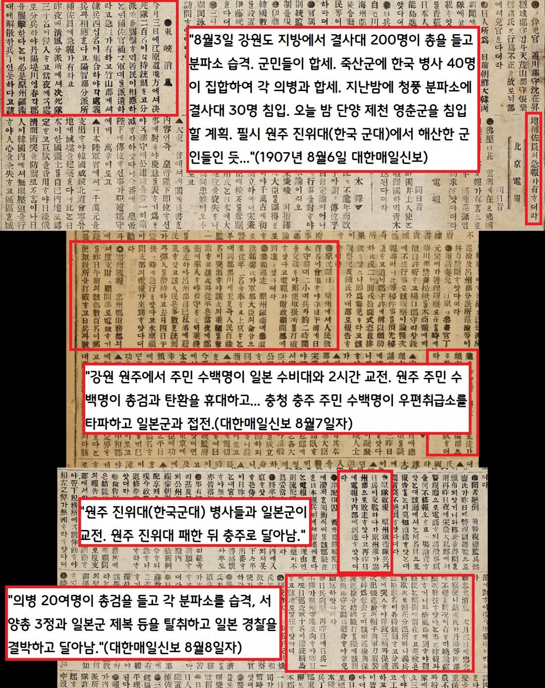 “한국의 내륙을 목격하고 귀국한 사람의 목격담인데…‘어느 날 저녁 의병 10명을 만났다…의병들은 민족을 구하지 않으면 중도에 죽기로 결심했다’고 밝혔다. 일본인들은 약탈하고 능욕하고 살인하고 있었다. 이 강도만도 못한 무리를…. 그들은 왜 그렇게 악하고 미친듯한 정책을 실시하는가….”(대한매일신보 영문판 ‘코리아데일리뉴스’ 1907년 9월24일)