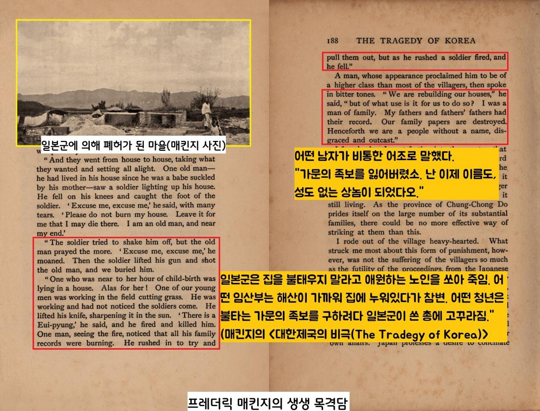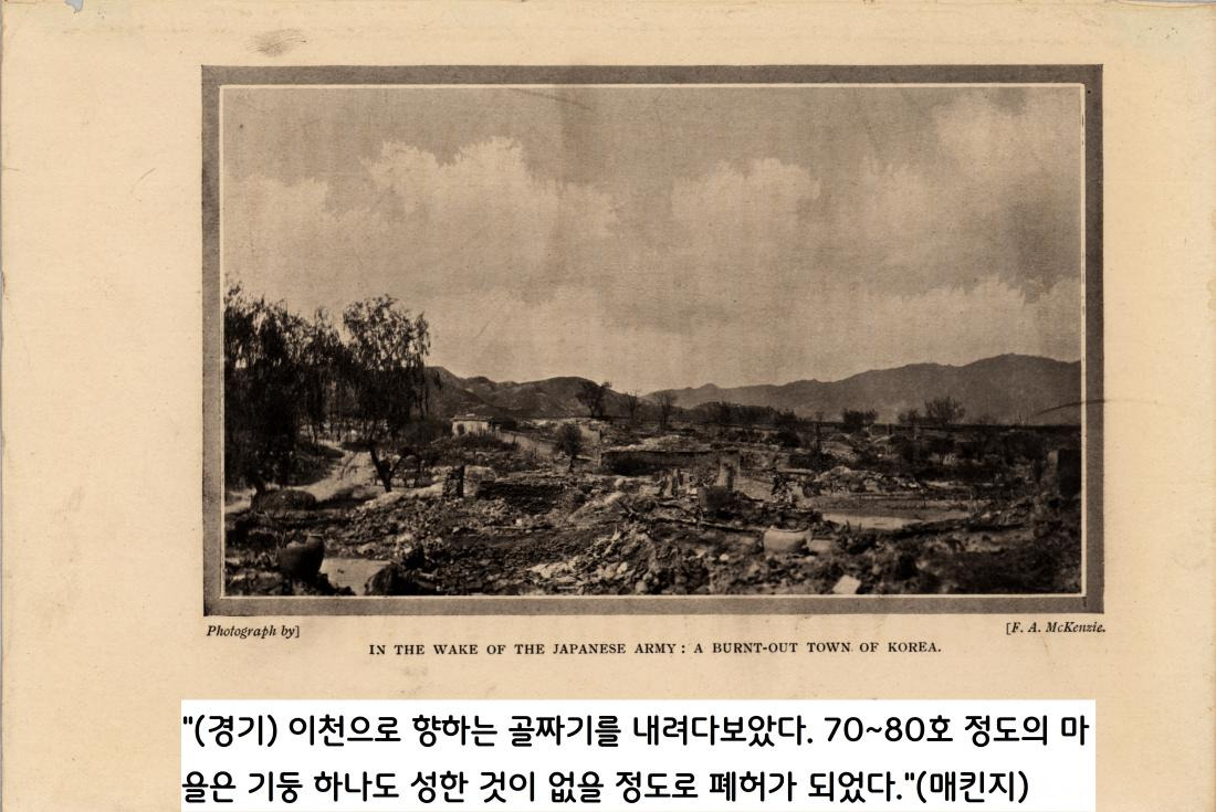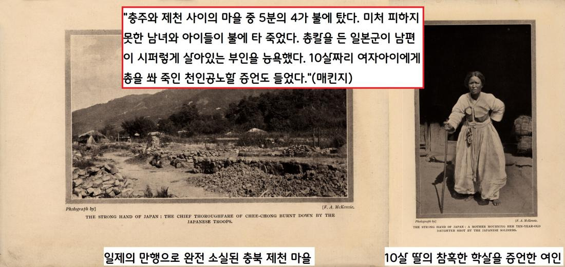 충북 제천과 충주의 상황도 끔찍했다. 매킨지는 “충주와 제천 사이의 마을 중 5분의 4가 불에 탔다”고 전했다. 이 와중에 미처 피하지 못한 남녀와 아이들이 불에 타 죽었다. 그 뿐이랴. 총칼을 든 일본군이 남편이 시퍼렇게 살아있는 부인을 능욕했다. 심지어 10살짜리 여자아이에게 총을 쏴 죽인 천인공노할 증언도 들었다.