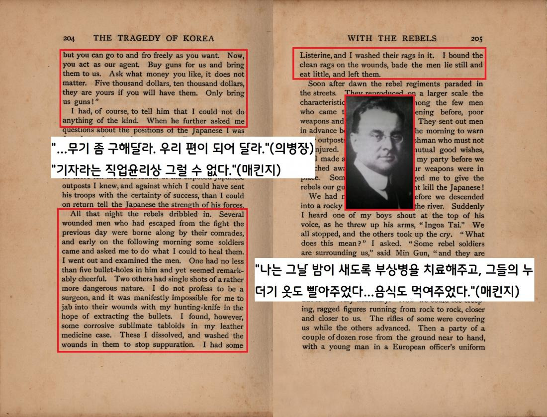 매킨지는 “그들을 가엾게 여겼던 내 생각이 틀렸다는 것을 알게 됐다”면서 “그들은 동포들에게 애국심이 무엇인지를 보여주고 있었다”고 밝혔다. 밤중에 의병대장이 매킨지를 찾아왔다. 의병장은 매킨지에게 “…제발 무기 좀 구해달라. 우리 편이 되어 달라”고 신신당부했다. 그러나 매킨지는 “기자라는 직업윤리상 그럴 수 없다”고 완곡하게 거절했다.
