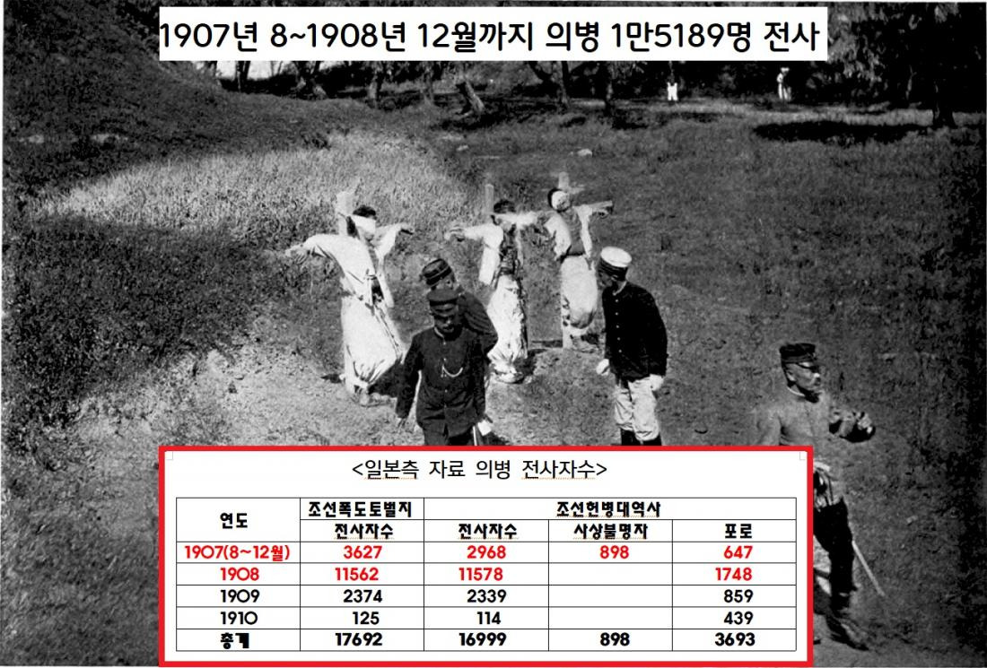 일본군이 작성한 <조선폭도토벌지> 등에 따르면 군대해산 직후인 1907년 8~1908년 12월 사이 전사한 항일 의병수가 무려 1만5000여명 달한다.