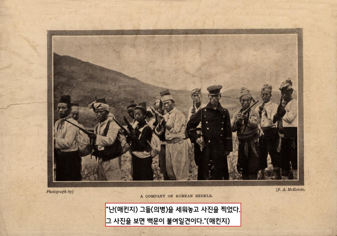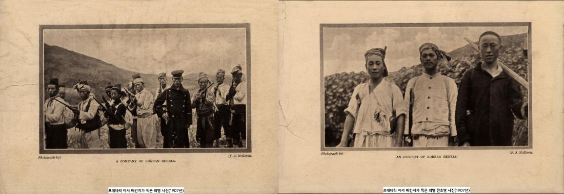 1907년 영국 데일리 메일 특파원인 프레더릭 아서 매킨지가 의병 항쟁의 현장인 경기 양평 등에서 찍은 의병 사진 두 장. 매킨지는 군대 해산 직후 요원의 불길처럼 번진 항일 의병 투쟁의 현장을 직접 누볐다. 일제의 만행을 목도했고, 의병들을 만나 인터뷰했다. 항일투쟁을 종군한 유일한 기자가 매킨지였다. 의병 사진도 이 두 장이 유이(唯二)하다.|독립기념관 자료