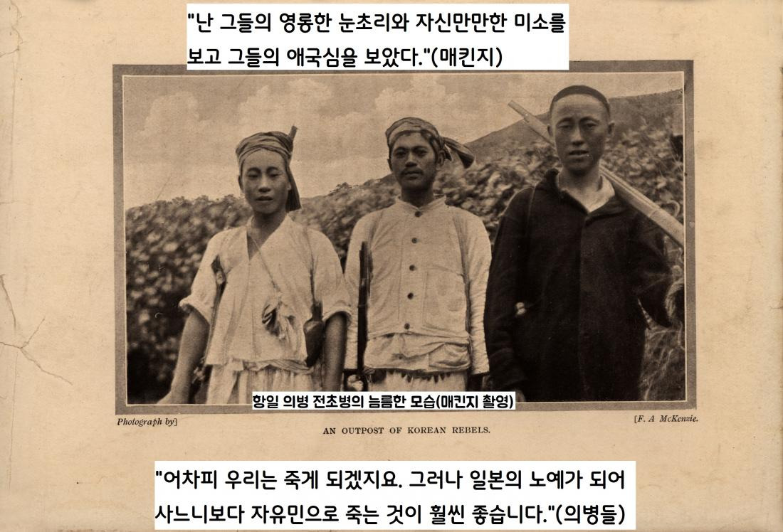 매킨지는 이들을 보고 “희망없는 전쟁에서 이미 죽음이 확실해진 이 사람들이 매우 측은하게만 보였다”고 했다. 이런 무장으로 일본 정규군과 싸우다니…. 그러나 매킨지는 곧 “의병의 영롱한 눈초리와 자신만만한 미소를 보고 그들의 애국심을 보았다”고 했다.