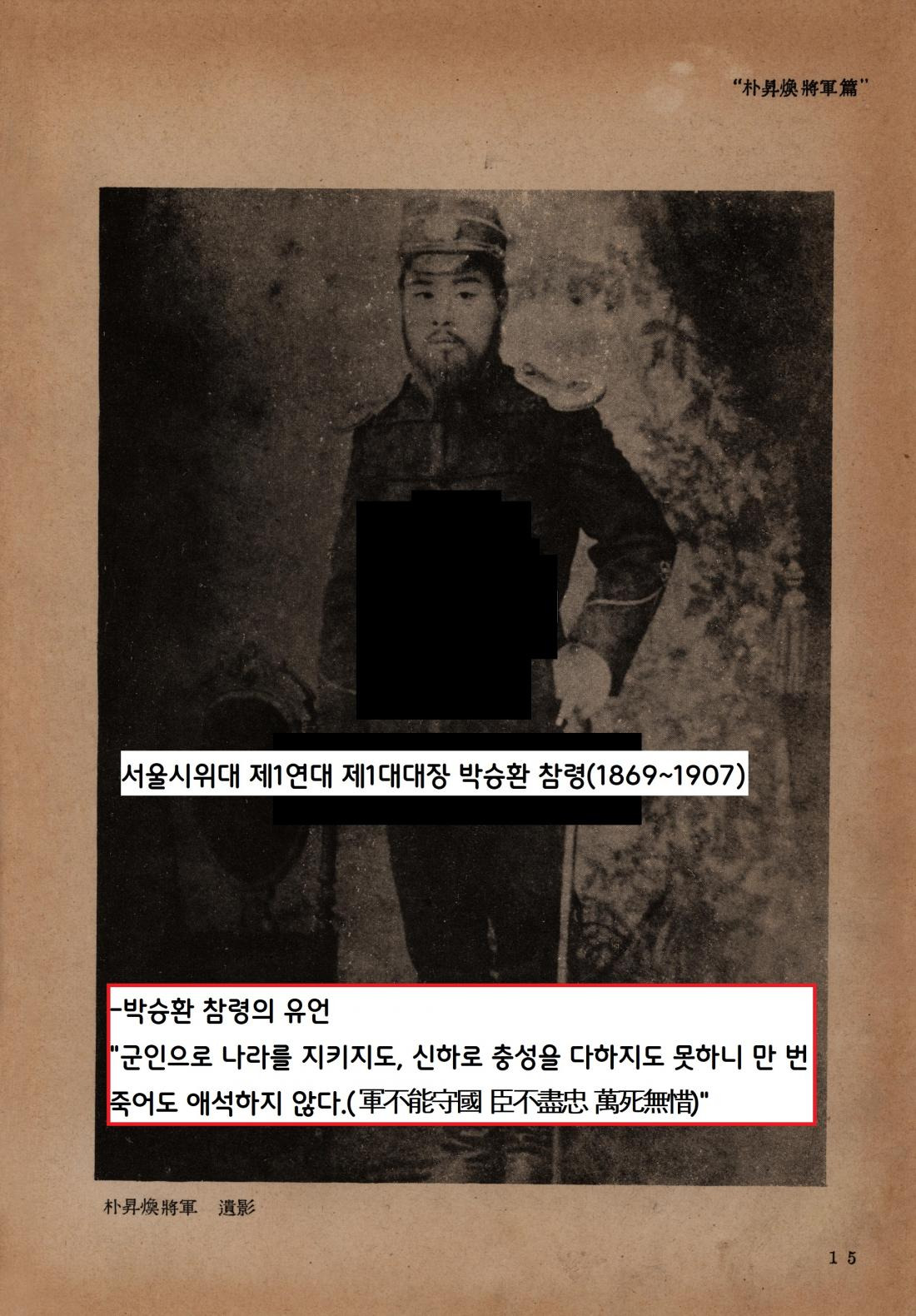 정미7조약의 각서 조항에 따라 군대가 해산되자(1907년 8월1일) 대한제국 서울시위대 제1연대 1대대장인 박승환 참령은 “군인으로 나라를 지키지 못하고 신하로 충성을 다하지 못하니 만 번 죽어도 애석하지 않다(軍不能守國 臣不盡忠 萬死無惜)”는 유서를 남기고 자결 순국했다.|독립기념관 자료