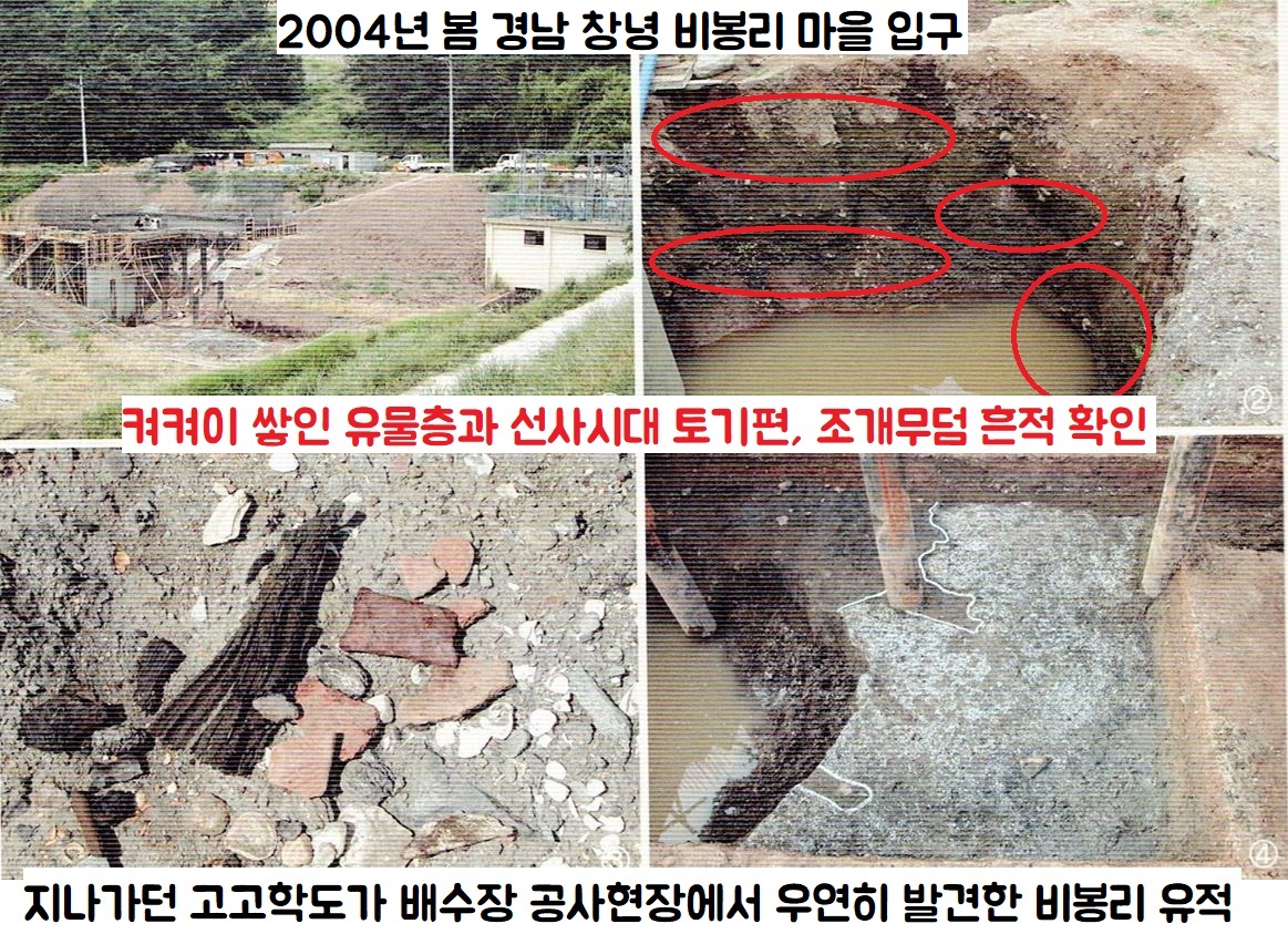 그는 양수장을 확장하려고 파낸 땅의 토층을 살피기 시작합니다. 그런데 그 토층에서 조개껍데기와 함께, 신석기 및 청동기 시대 토기편이 보였습니다. 조사원은 즉각 창녕군에 발견사실을 신고했습니다.
