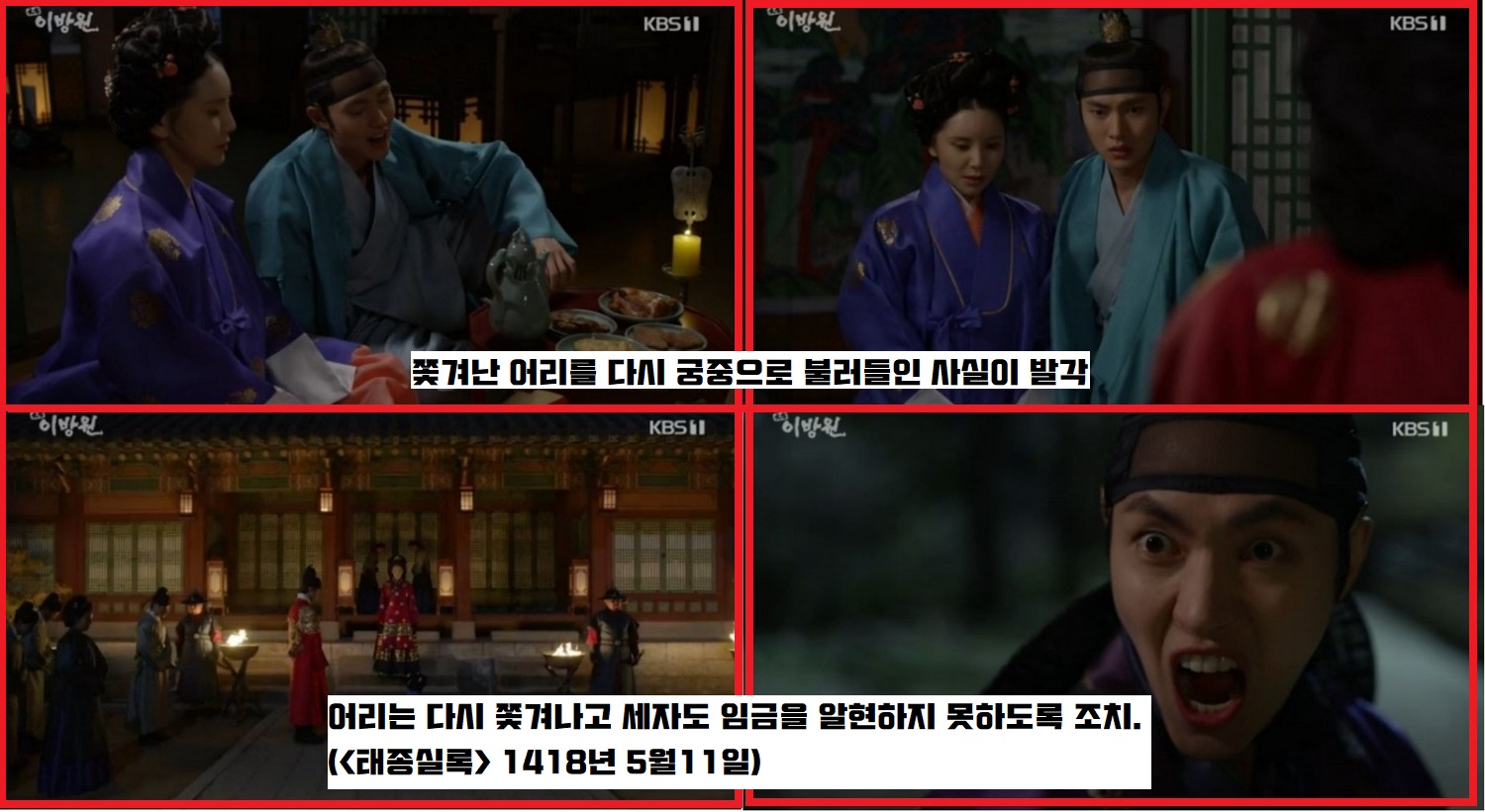 그러나 사건은 그것으로 끝나지 않았죠. 세자가 쫓겨난 어리를 다시 동궁으로 들인 겁니다. 설상가상으로 어리가 덜컥 세자의 아이를 낳게 되었습니다. 이 일이 또 발각되어 어리가 다시 쫓겨납니다. 어리는 훗날(1419년 1월30일) 연금 중이던 양녕대군의 탈출사건 때문에 억울한 누명 때문에 목을 매어 죽고 말죠.