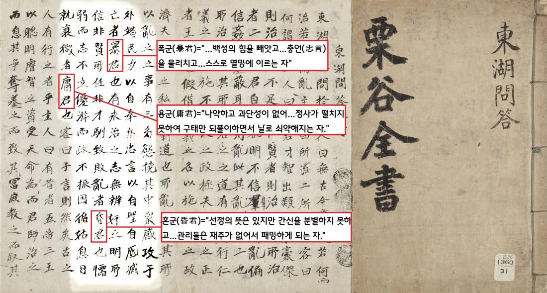 역사적으로 잘못된 정치를 펼친 군주를 지칭할 때, 혼군(昏君·혹은 암군), 용군(庸君), 혹은 폭군(暴君)이라는 용어를 쓴다. 율곡 이이가 1569년 독서휴가 중 문답체로 선조임금에게 올린 ‘동호문답’에서 그 의미를 명쾌하게 구분해놓았다.|규장각 한국학연구원 자료