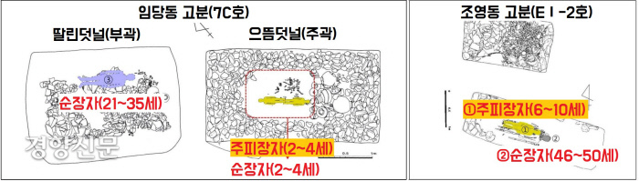 5세기 중후반에 조성된 다른 무덤에서는 ‘으뜸덧널(주곽)’에 안장된 주인공(성인 남성·31~40세)의 곁에, 여자아이(4~8세)가 누워 있었는데요. 그런데 그의 발치에 축조된 ‘딸린 덧널’ 안에는 성인 남성(41~60세)과 성인 여성(36~50세)이 순장되어 있었습니다. DNA 분석결과 ‘딸린 덧널’에 순장된 성인 남녀는 부부이고요. 이 부부의 딸이 무덤 주인공 곁에 순장된 여아(4~8세)임을 밝혀졌습니다.