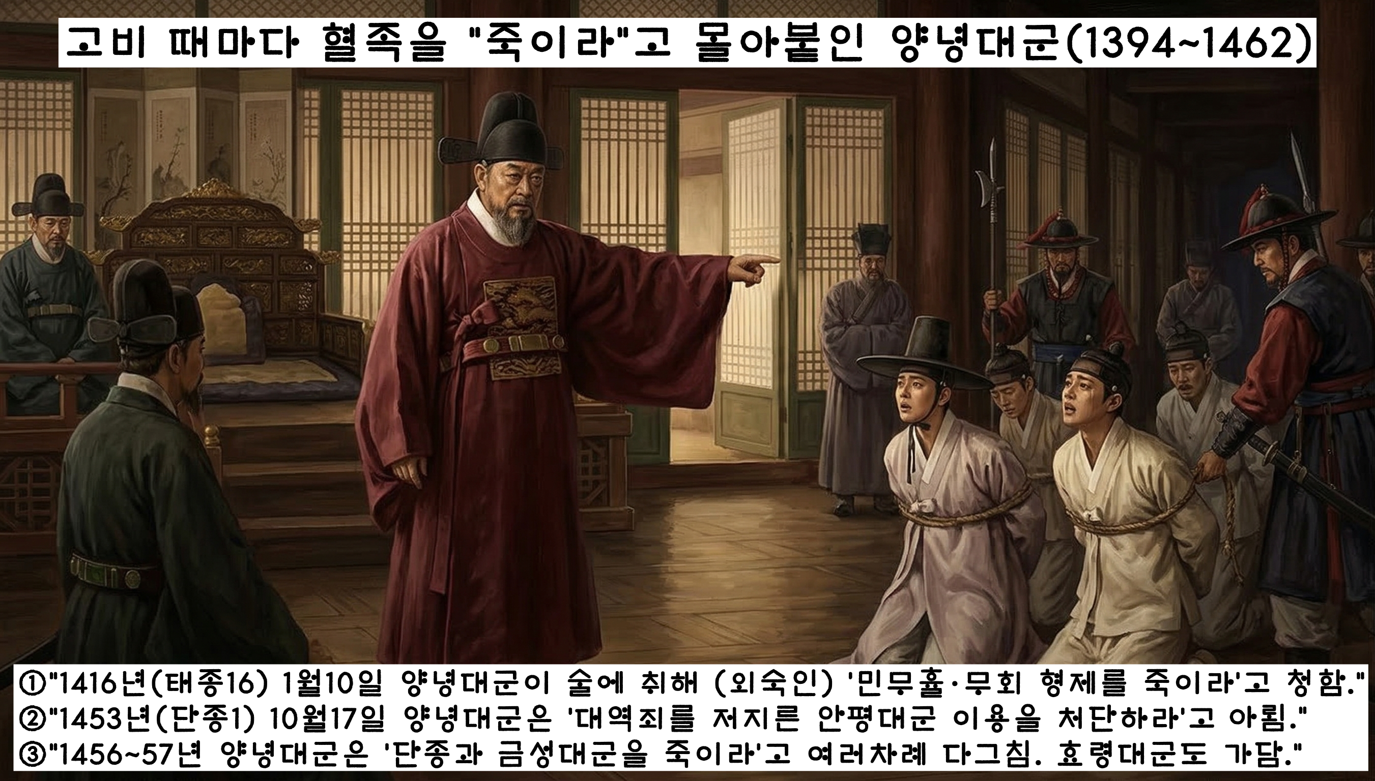 그중에서도 원톱은 종친의 큰 어른인 양녕대군이었다. 이미 외숙(민무휼 민무회 형제)에 이어 조카(안평대군)을 처단하라고 주장한 바 있던 양녕대군은 조카손주인 노산군(단종)과 조카인 금성대군까지 "죽여야 한다"고 다그쳤다.