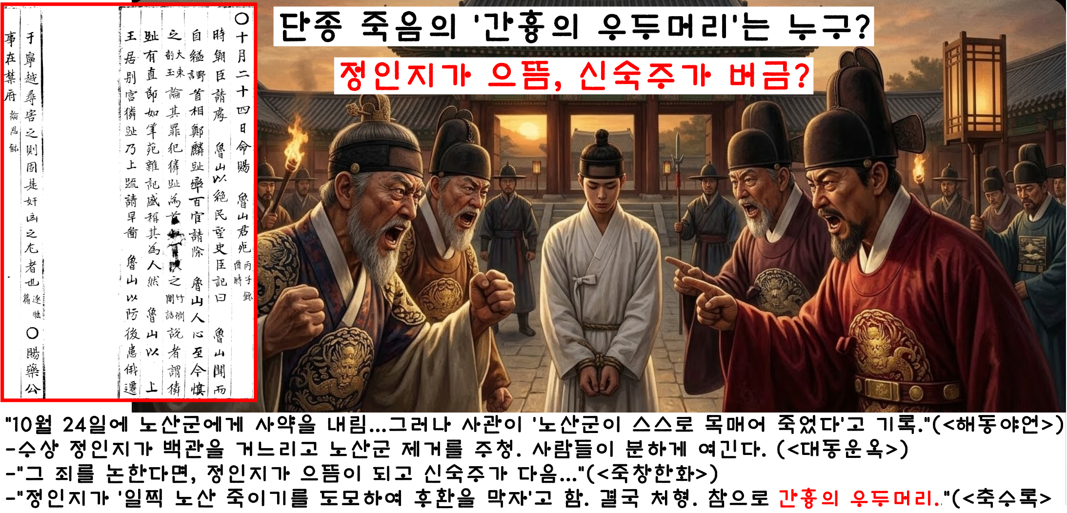 그러나 어린 단종을 죽음으로 몰아놓은 이들은 따로 있었다. 즉 종친의 큰 어른들인 양녕대군과 효령대군, 그리고 대신들의 우두머리 격인 영의정 정인지와 좌찬성 신숙주 등이었다. 이들은 노산군(단종)과 금성대군을 죽여야 한다고 강력히 촉구했다.