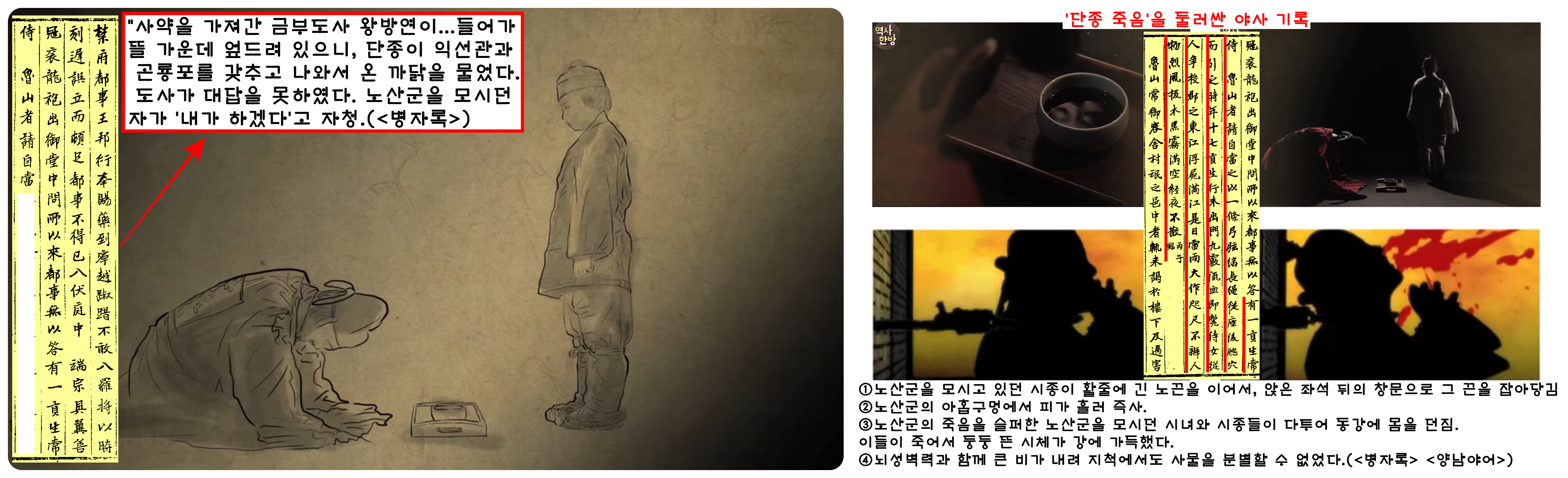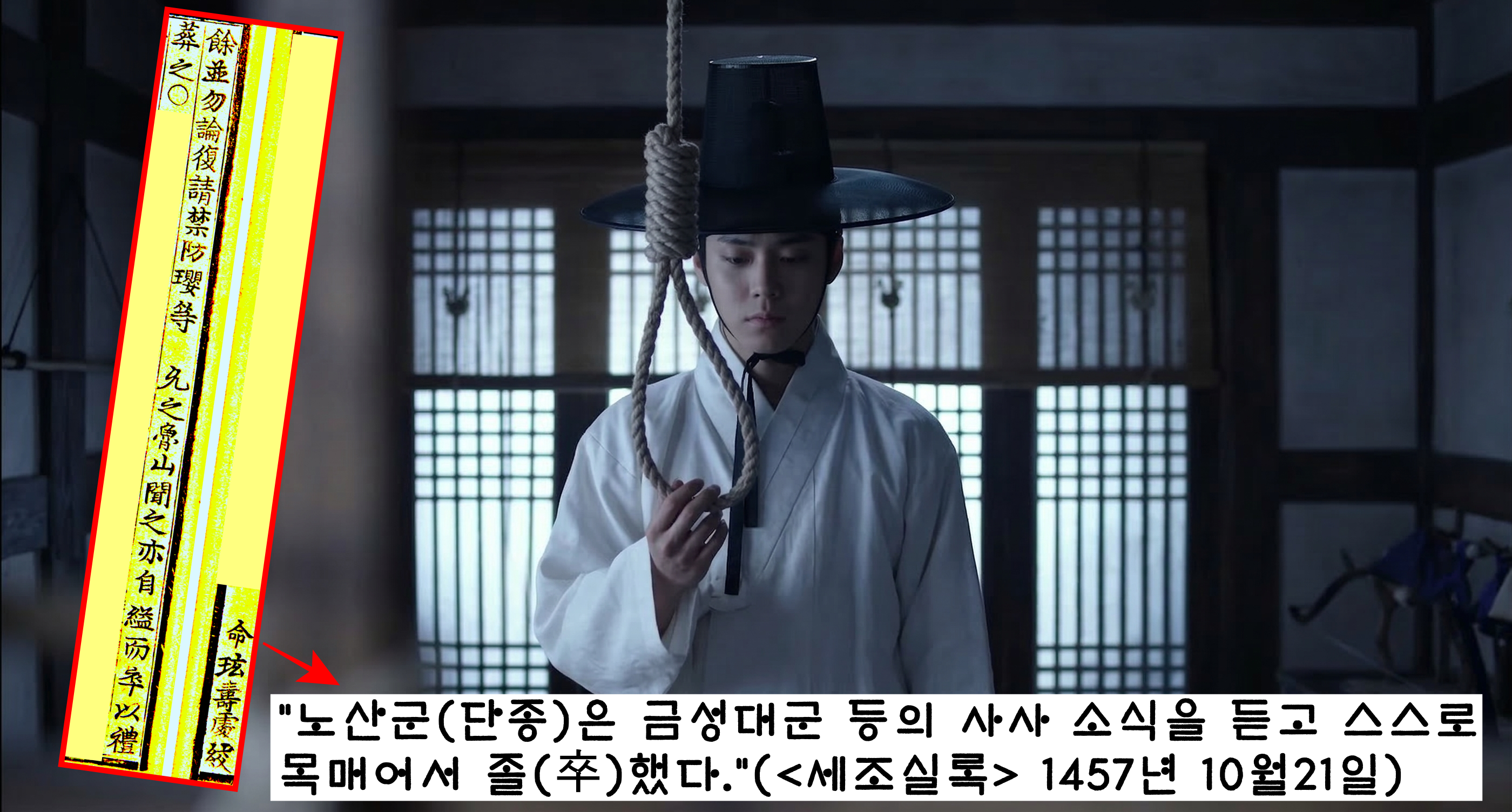 단종의 죽음과 관련, <세조실록>은 "(반역을 일으켰다는 혐의를 받은) 금성대군이 사약을 받았다는 속식을 들은 노산군(단종)이 스스로 목을 맸다"고 기록했다.