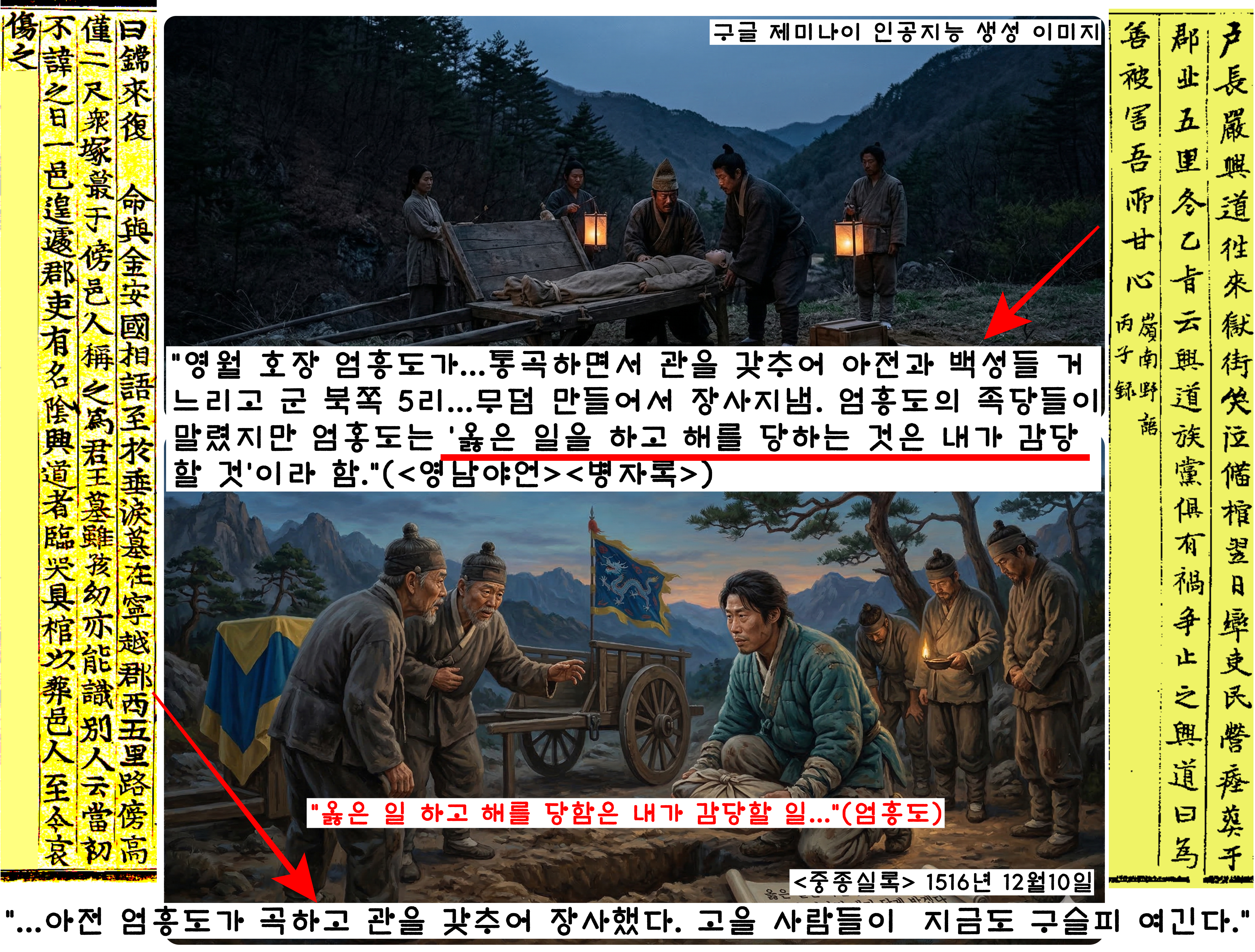 ■엄흥도의 등장 이때 등장하는 인물이 바로 영화 <왕과 사는 남자>에 등장하는 엄흥도(생몰년 미상)이다. “호장(향리 우두머리) 엄흥도가 옥거리(獄街)에 왕래하며 통곡하면서 관(棺)을 갖추어 이튿날 아전과 백성들을 거느리고 군 북쪽 5리 되는 동을지(冬乙旨)에 무덤을 만들어서 장사지냈다.”(<영남야어> <병자록>) 이에 엄흥도의 문중이 “자칫 화를 입을까 두렵다”고 말렸다. 그러나 엄흥도는 “옳은 일을 하는 것이니, 해(害)는 내가 달게 받을 것”이라 했다. 당대의 문신·학자인 이자(1480~1533)가 1509~1516년 사이 조정에서 일어난 사건들을 기록한 <음애일기>는 특히 “노산군이 자진했다”는 <세조실록> 기록을 두고 ‘여우나 쥐 같은 놈들의 간악하고 아첨하는 붓장난’이라고 비판했다. “이것은 후일에 실록을 편수한 자들이 모두 당시에 세조를 따랐던 자들이다. <세조실록>에는 대개 이러한 내용이 많다.”
