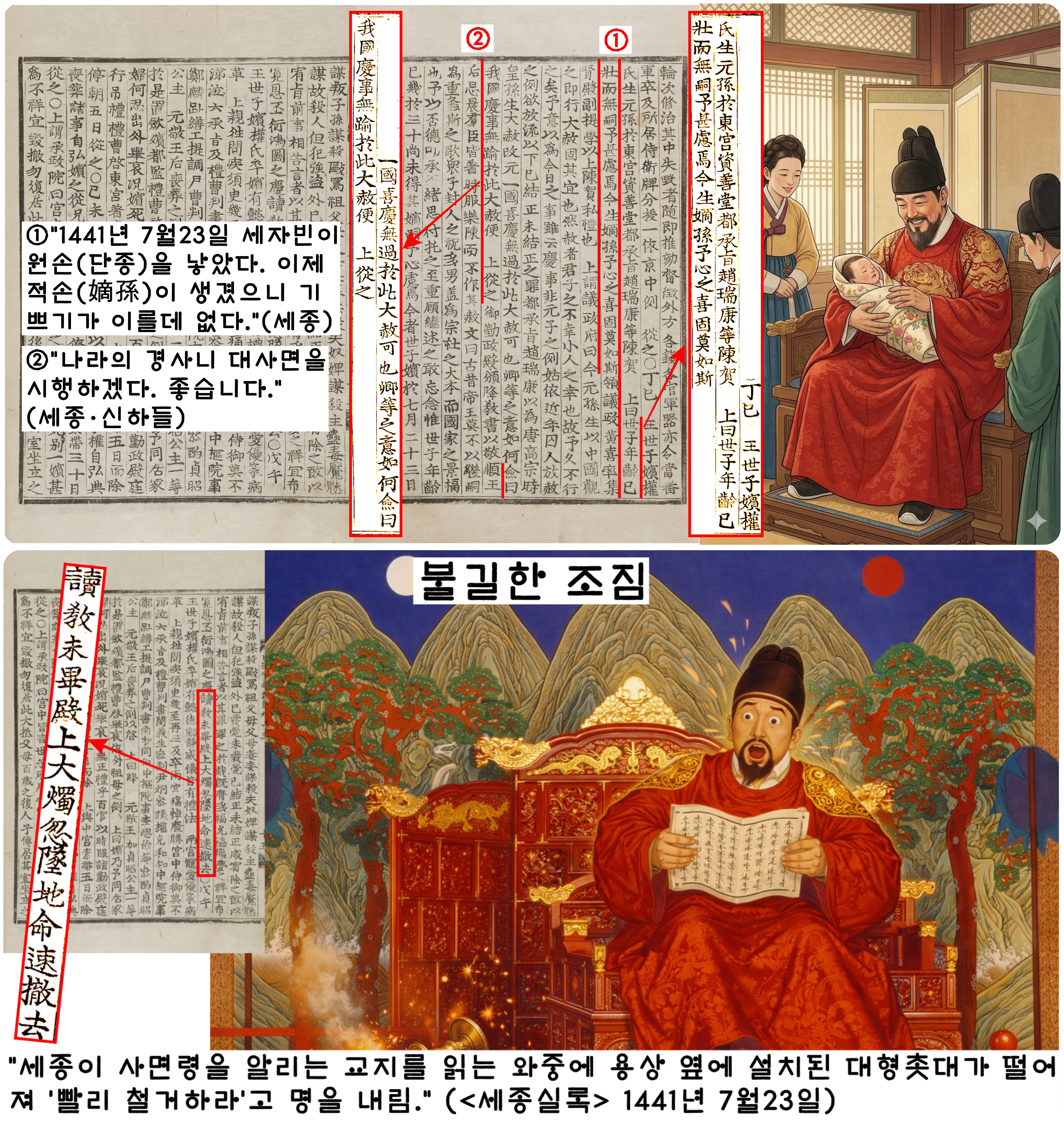 비운의 임금인 단종은 출생 때부터 불길한 조짐을 보였다. <세종실록>은 1441년 7월23일 "원손(단종)이 태어나자 할아버지 세종이 뛸 듯이 기뻐하며 대사면령을 내렸다"고 전했다. 그런데 실록은 "세종이 사면령의 교지를 읽을 때 용상에 설치되었던 대형 촛대가 떨어져 세종이 급히 치우도록 했다"고 덧붙였다.