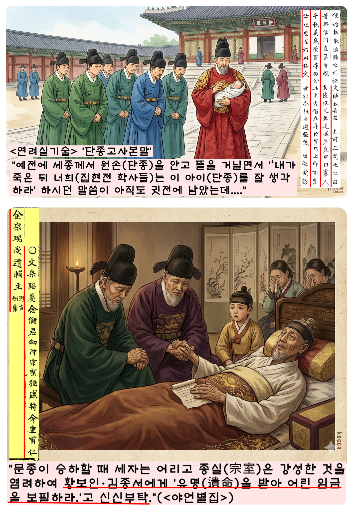 ■“이 아이를 돌봐달라.” 어느 날 어린 세손(단종)을 품에 안고 예뻐하던 세종은 성삼문(1418~1456) 등 집현전 학사들에게 “이 아이를 잘 돌봐달라”고 부탁했다. “세종께서 원손(단종)을 안고 뜰을 거닐면서 ‘내가 죽은 뒤 너희(집현전 학사들)는 이 아이(단종)를 잘 생각하라’ 하시던 말씀이 아직도 귓전에 남았는데….”(<연려실기술> ‘단종조 고사본말’) 세종의 노심초사였다. 그것은 단종의 아버지인 문종(1414~1452)도 마찬가지였다. 무엇보다 문종의 재위 기간이 너무 짧았다. 1450년 세종의 승하로 왕위를 이은 문종은 재위 2년 만인 1452년(문종2) 5월14일 서거했다. 향년 39살이었다. 문종이 세상을 떠나기 직전 재상인 황보인(영의정·1387~1453)·김종서(우의정·1383~1453) 등의 손을 잡고 신신당부했다. “과인의 유명(遺命·임종 때의 명령)을 받들어 어린 임금(단종)을 보필해 주세요.” 이렇게 임금의 유언으로 나라의 뒷일을 부탁받은 신하를 고명대신(顧命大臣)이라 한다. 그때 세자(단종)의 춘추는 한국 나이로 겨우 12살이었다.