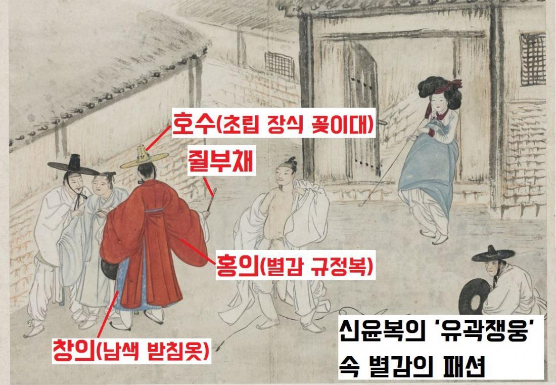 홍의는 다홍색 생초(삶지 않는 명주실로 짠 비단)로 만든다. 신윤복(1758~?)의 풍속도 ‘유곽쟁웅’과 ‘주사거배’, ‘야금모행’, 유숙(1827~1873)의 ‘대쾌도’에는 한눈에도 도드라진 빨간 패션의 별감이 보인다.
