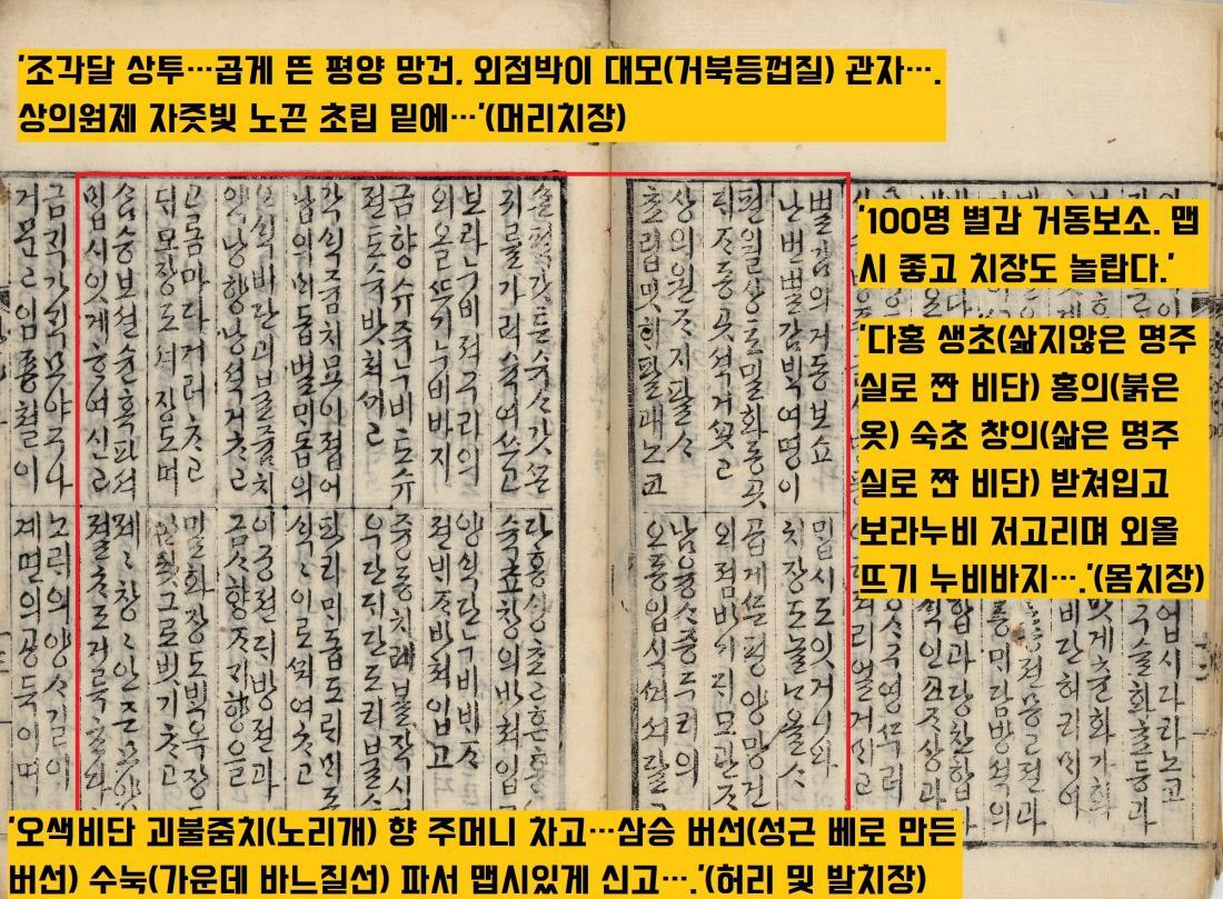 “다홍 생초(삶지않은 명주실로 짠 비단) 홍의(붉은 옷) 숙초 창의(삶은 명주실로 짠 비단) 받쳐입고 보라누비 저고리며 외올뜨기 누비바지….”(몸치장)