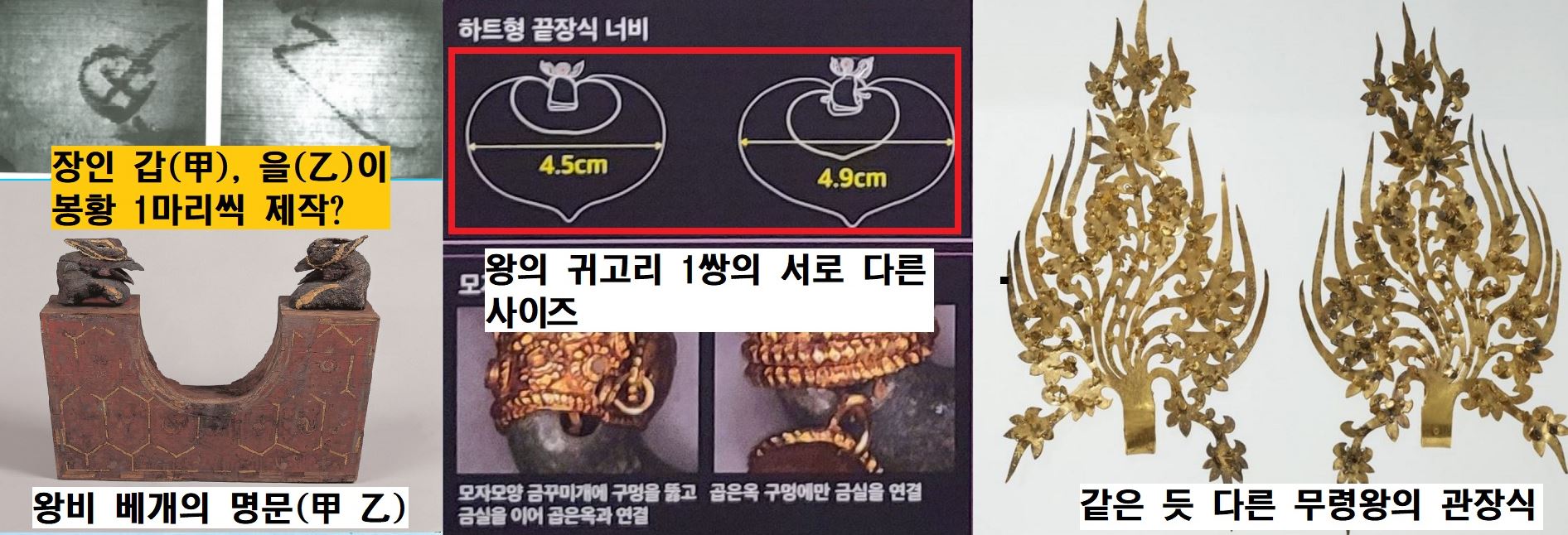 이는 한 쌍의 유물을 한 사람이 순차적으로 만든 것이라기보다는, 두 사람의 장인이 동시에 하나씩 만들었을 가능성을 배제할 수 없다는 겁니다. 무령왕릉 왕비의 목제 두침(베개)에서 ‘갑’과 ‘을’의 명문이 확인되었는데요. 이것은 두 마리의 봉황을 각각 만들었던 방증자료가 될 수 있습니다. 그렇다면 무령왕과 왕비의 장신구를 제작한 것은 ‘다리’와 같은 장인을 책임자로 둔 명품 제조 업체였을 수도 있습니다.