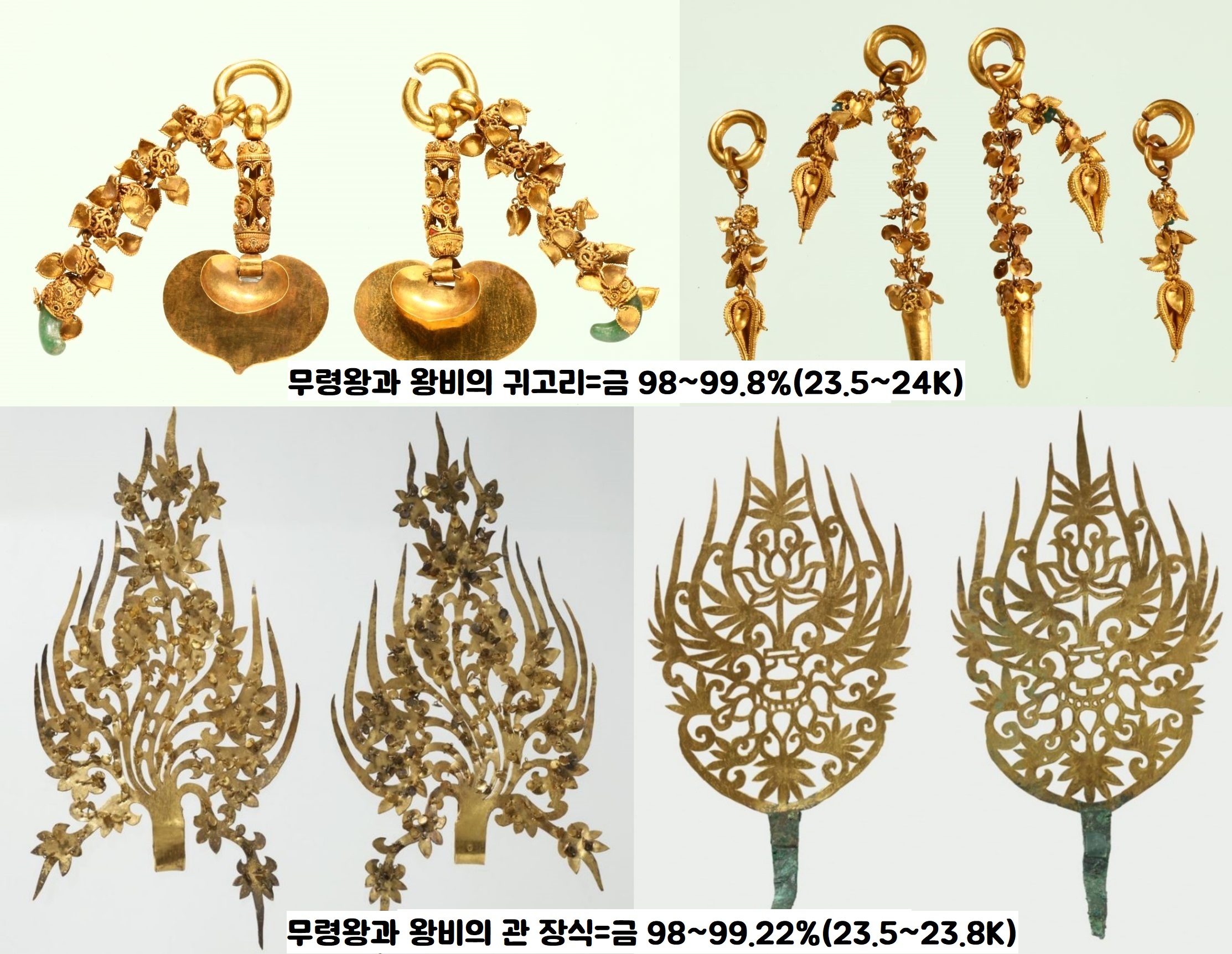 왕과 왕비가 직접 착장한 것으로 보이는 관장식과, 그 관장식을 꾸미려고 사용한 부품, 그리고 금귀고리, 금목걸이 등의 금함유량이 순금(24K)에 근접했거나 24K에 도달했다는 겁니다. 그러나 왕이 머리 뒷부분에 꽂힌 금뒤꽂이나 머리카락을 흐트러지지 않게 잡아묶는데 사용한 각종 장식 등은 90.5~96.5%정도로 제작되었음을 알 수 있습니다.
