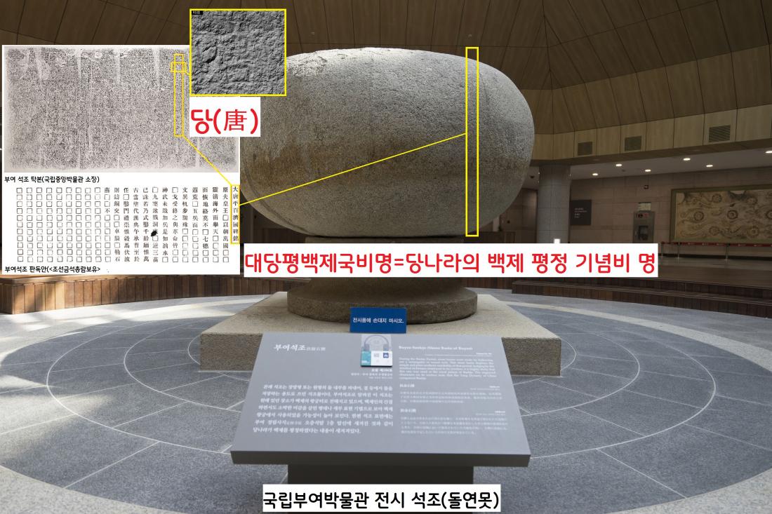 국립부여박물관에 전시중인 보물 ‘부여 석조(돌연못)’에 새겨진 ‘대당평백제국비명’. 당나라가 백제를 멸망시킨 기념으로 세운 비명이라는 뜻이다.|김지호 국립중앙박물관 학예연구사 제공