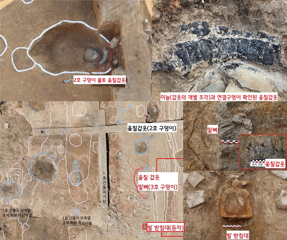 이것들은 ‘옻칠한 갑옷(칠피갑옷)’으로 판명되었다. 갑옷 조각은 모두 6곳이 확인됐다. 그중 한 구덩이에서는 갑옷과 함께 말의 아래턱 뼈가 나왔다. 주변의 기와폐기층에서는 말안장 부속품(발받침대·등자)이 확인됐다. 이 구덩이의 갑옷은 마갑(말갑옷)일 가능성이 짙다.