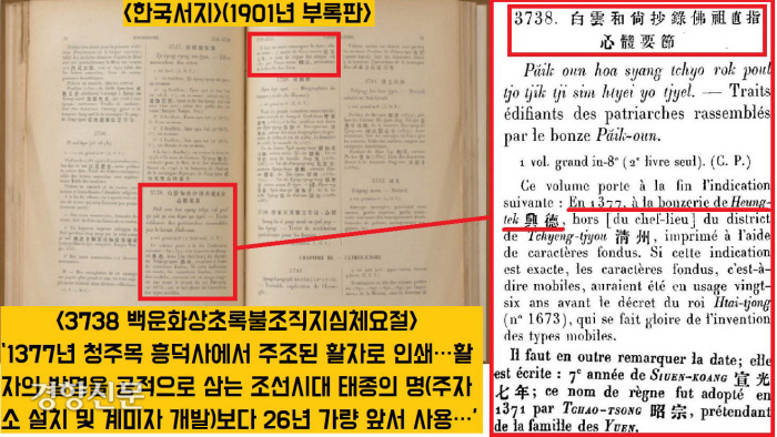 “3738 백운화상초록불조직지심체요절(白雲和尙抄錄佛祖直指心體要節) 1책…이 책의 마지막 설명문이 중요하다. ‘1377년 청주목 바깥의 흥덕사에서 주조된 활자로 인쇄됨.’ 이 내용이 정확하다면 활자는…조선 태종의 명(1403년 주자소 설치 및 계미자 주조)보다 26년 가량 앞서 사용….”
